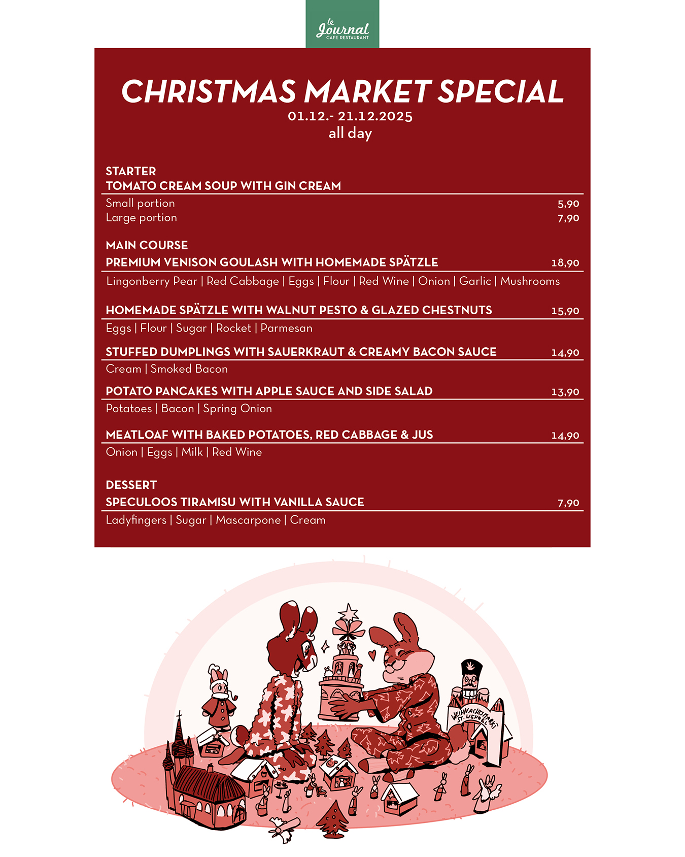 durchgehend warme Küche von 11.30 Uhr bis Open End (mind. bis 21.00 Uhr)