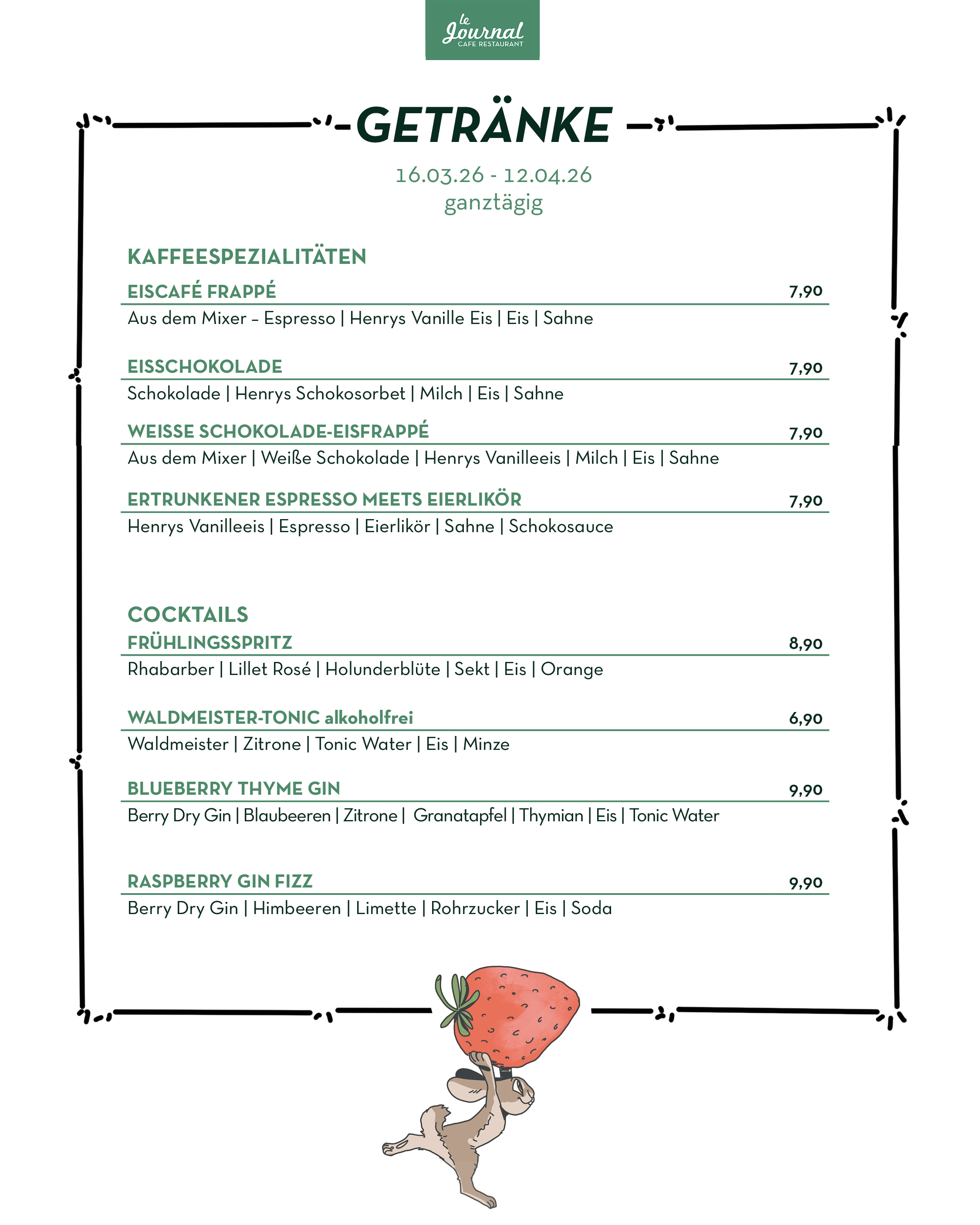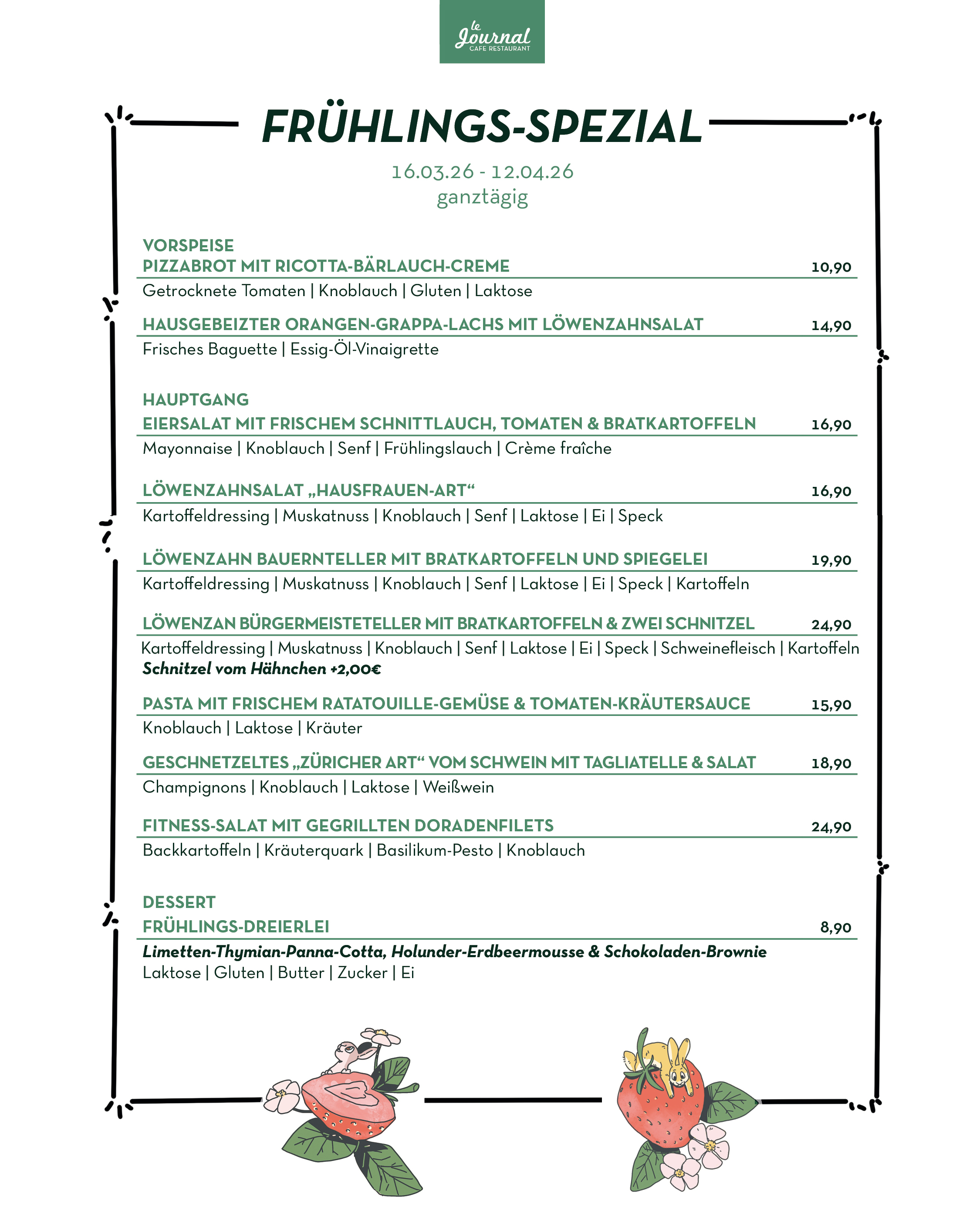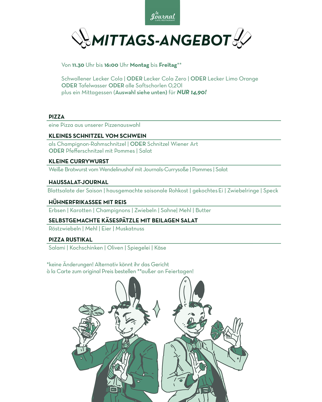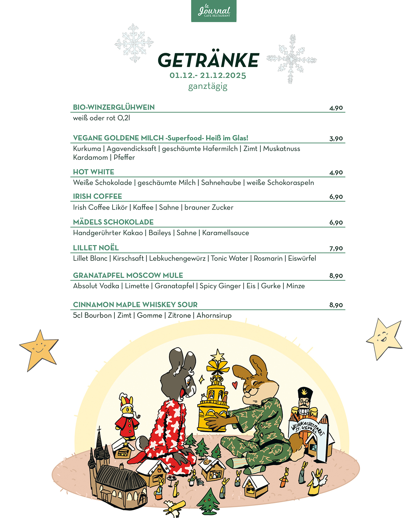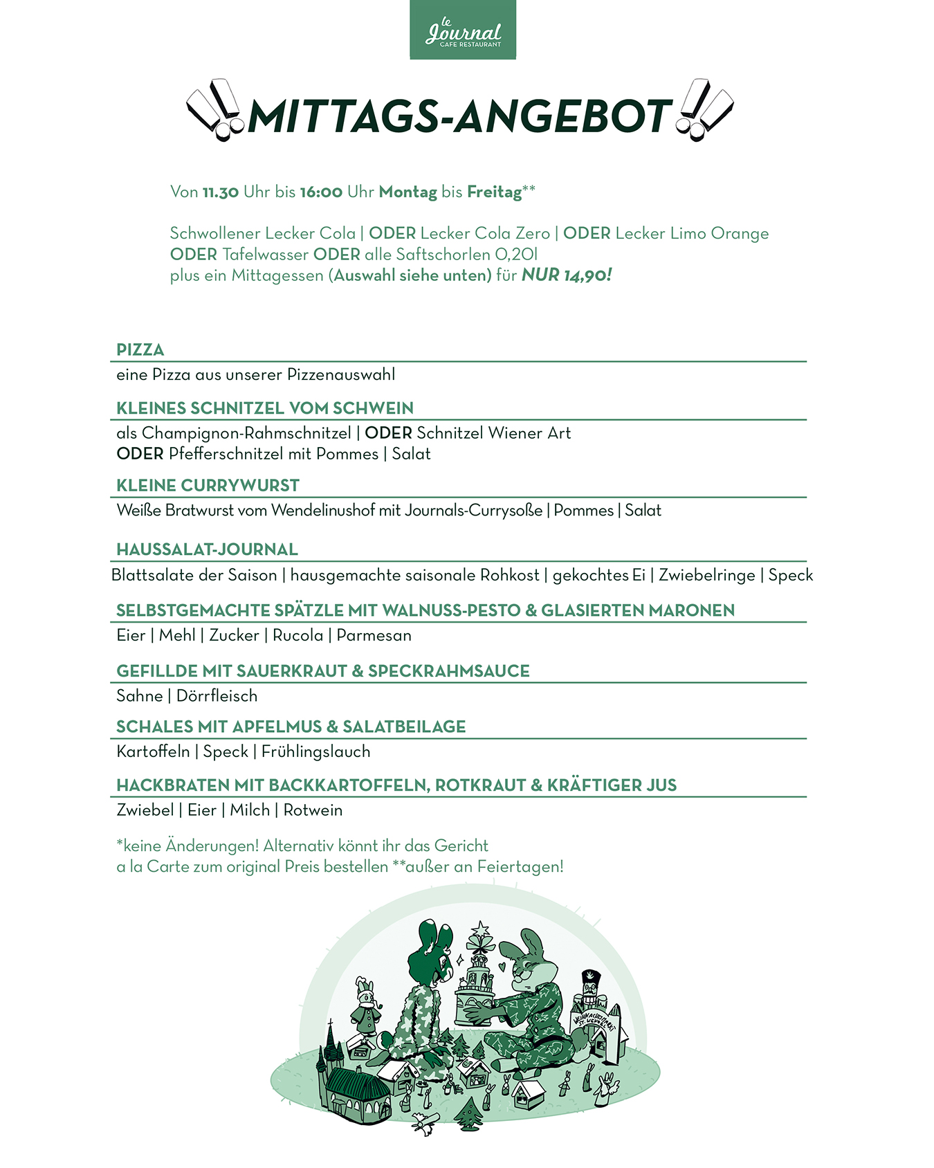 durchgehend warme Küche von 11.30 Uhr bis Open End (mind. bis 21.00 Uhr)